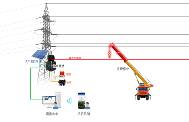 天河电子基于激光雷达的架空输电线路防护系统,旨在弥补视频监控技术、传感器报警技术被动防御的特性和智能图像分析技术在环境应用中的局限性,利用激光雷达主动防御的特性,结合高清视频监控技术,对闯入电力高压线下3-5米目标(如违章作业吊车)进行定位、跟踪、放大,现场警示违章作业人员,同时上传告警视频或图片给监管单位进行相应警情处置。
